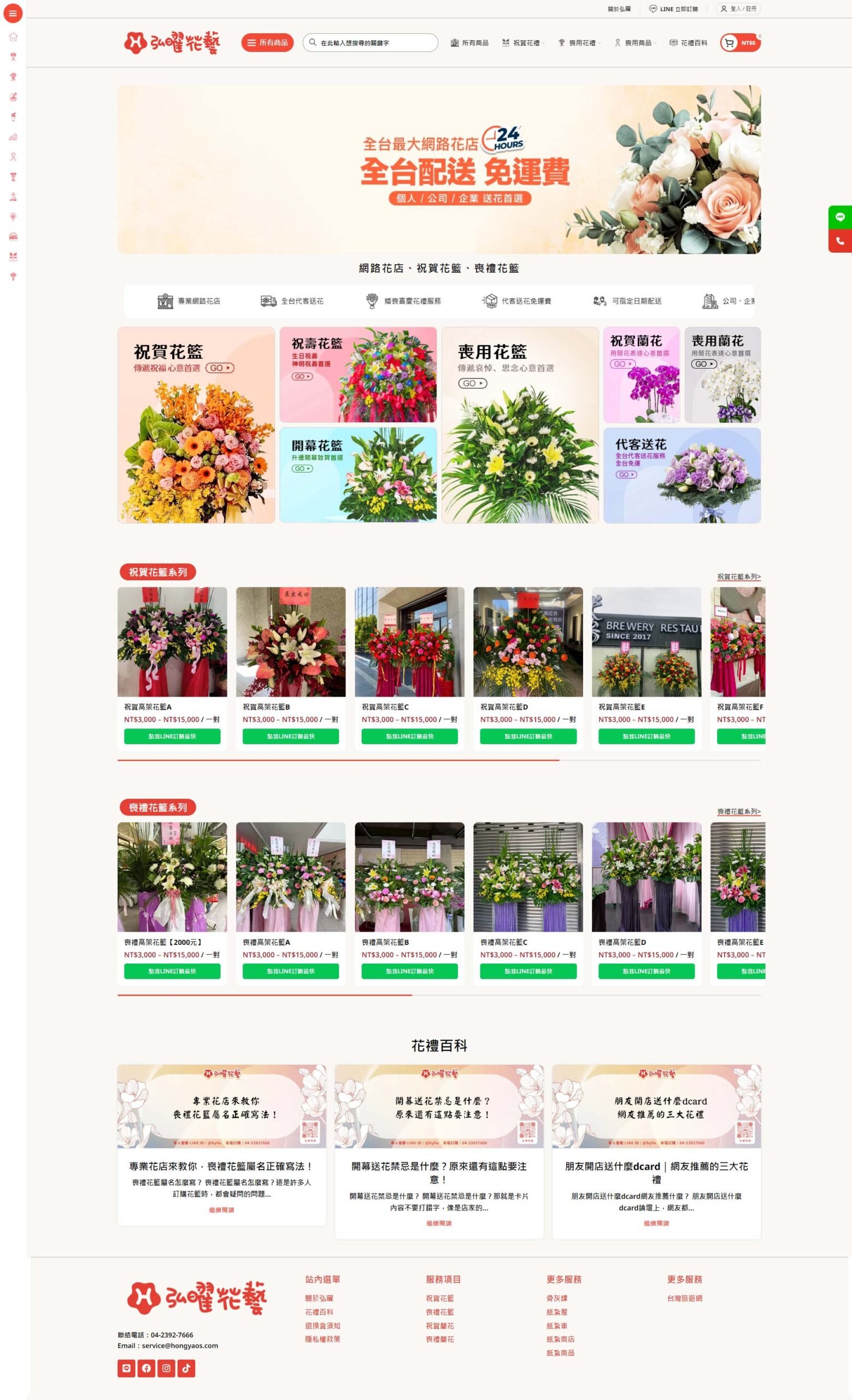 弘曜花藝是一個線上花禮/花藝服務網站,提供多種「花禮產品 + 配送服務」。網站服務定位是很全面的,既涵蓋「慶典/祝賀」場合,也涵蓋「哀悼/追思」場合,並且包含傳統紙紮商品與花禮/蘭花,適合不同文化/需求背景下的用戶同時,網站支援線上下單/配送、有固定聯絡方式 (電話、Email、官方 LINE 帳號) —— 對使用者來說,降低了溝通與訂購門檻,增強信任與便利性